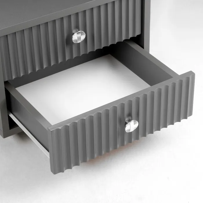 • Фактурные детали: Вертикальные рельефные полосы на фасаде ящиков добавляют текстуру и визуальный интерес, делая тумбу более выразительной.