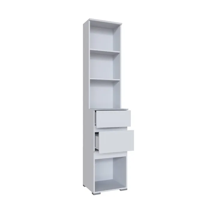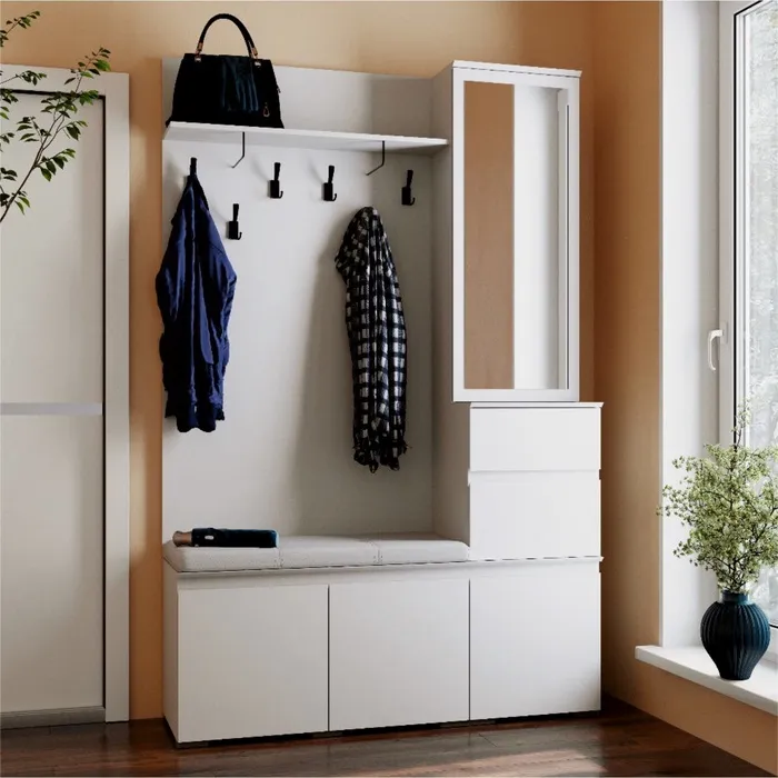 Тумба с ящиками, 450х412х2100, Белый (Прихожая Плейона ) - это функциональное и стильное решение для организации пространства прихожей. Изготовлена из высококачественного и прочного материала ЛДСП, обеспечивая долговечность и надежность конструкции. В двух выдвижных ящиках с роликовыми направляющими можно хранить ключи и другие предметы, за распашной дверкой снизу поместится обувь, а на полках за зеркалом уместятся аксессуары и другие важные вещи.