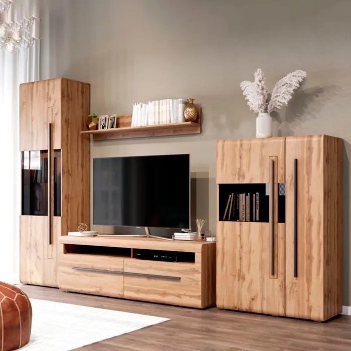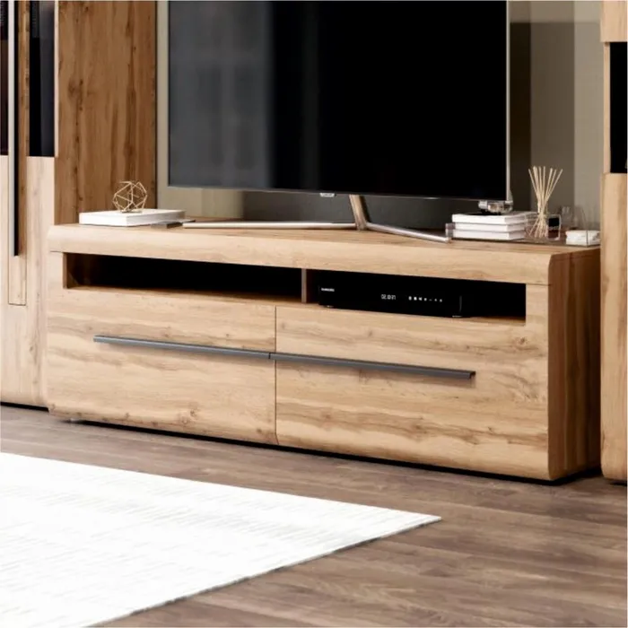 Тумба ТВ "Ницца", 1598х516х520 выполнена в популярном цвете Дуб Вотан. Светло-коричневый оттенок с рустикальной древесной текстурой принесет вашему интерьеру уютное тепло и комфорт. Стиль изделия подчеркивают черные металлические ручки. Тумба имеет открытое отделение для хранения и два объемных выдвижных ящика на шариковых направляющих.
