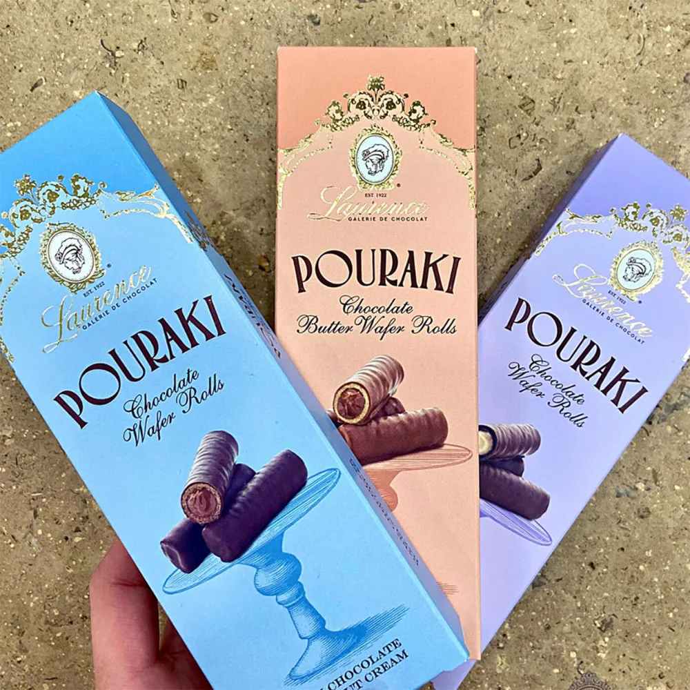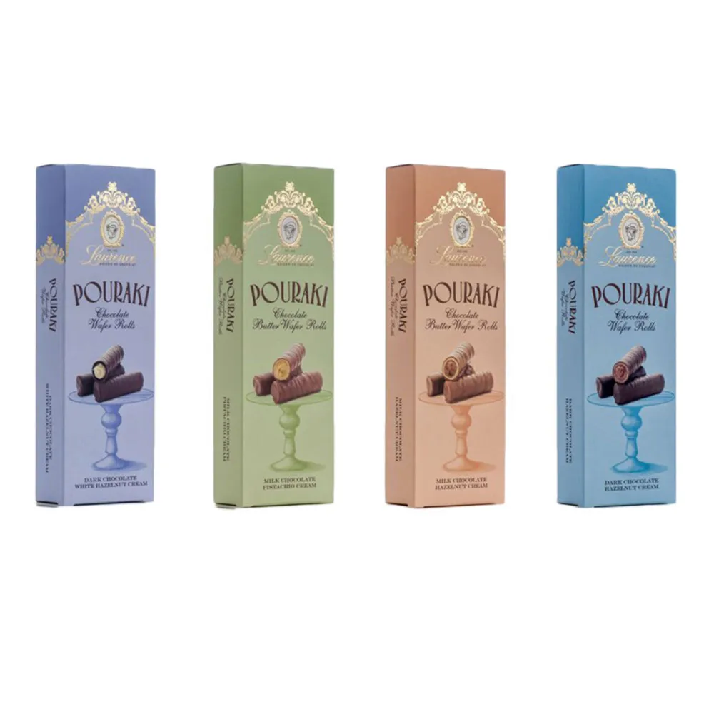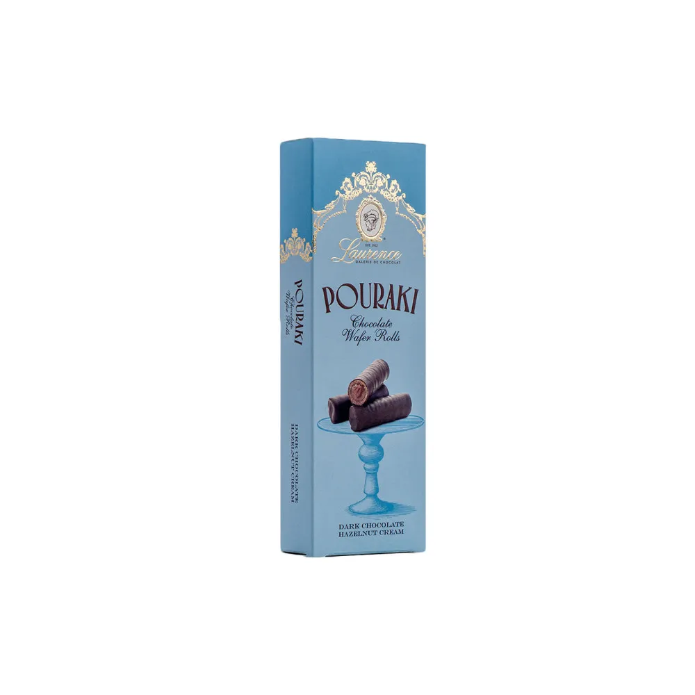 Восхитительные шоколадные рулеты с кремом из лесного ореха и покрытием из темного шоколада известны под названием «сигариллы» (или pouraki по-гречески). Как любители темного шоколада, так и искатели новых вкусов обязательно влюбятся в эти лакомства. Элегантная белая упаковка содержит четыре шоколадных рулета и отлично подходит для подарка!