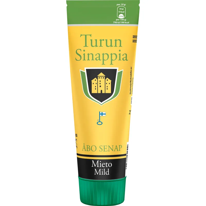 Традиционная и подлинно финская мягкая горчица Turun sinappi обязательно должна быть на финском столе, как в будни, так и в праздники. Мягкий вкус горчицы отлично подходит, например, к гриль-колбаскам, гамбургерам и хот-догам, гороховому супу и бутербродам. Вы узнаете мягкую горчицу Turun sinappi по зелёной упаковке.