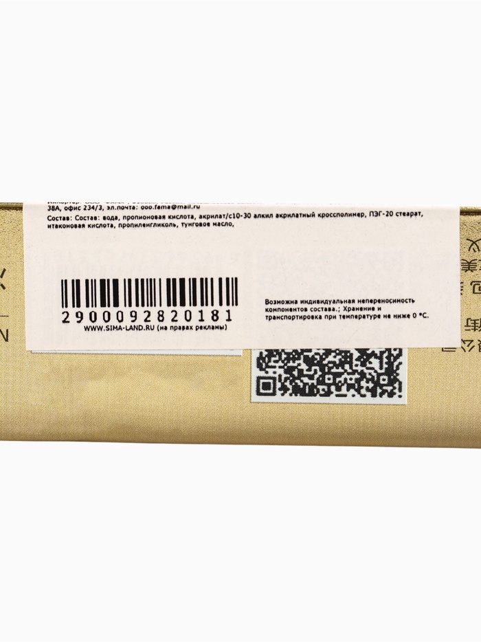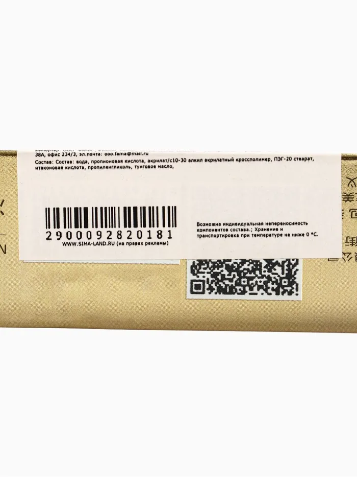 Состав: вода, пропионовая кислота, акрилат/c10-30 алкил акрилатный кроссполимер, ПЭГ-20 стеарат, итаконовая кислота, пропиленгликоль, тунговое масло, изостеариловый спирт, глицерин, стеариновая кислота (октадекановая кислота), синтетический пчелиный воск, коперниция восковая(карнаубский воск), поликватерниум-7, феноксиэтанол, Cl77499.