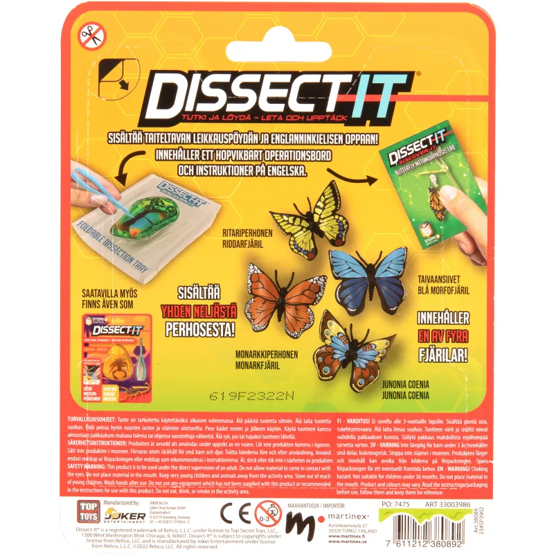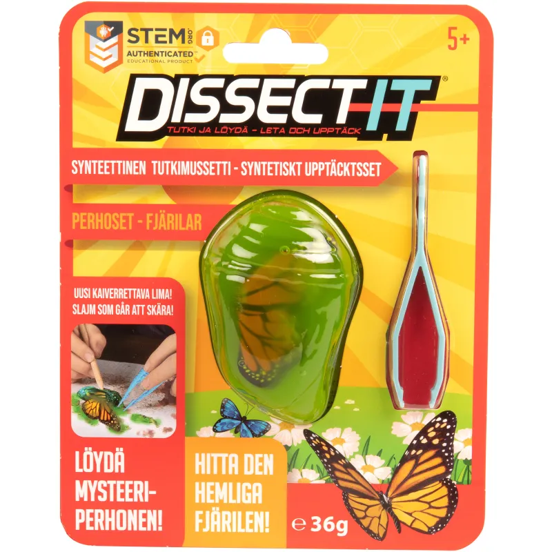 Исследовательский набор Dissect It содержит бабочку, заключенную в кусок резного слизи. Используйте безопасный двусторонний инструмент с скальпелем и пинцетом, чтобы извлечь синтетическую бабочку из кокона. В комплект входит складной стол для резки и инструкции на английском языке. Узнайте увлекательные факты о бабочках и их жизненном цикле. Доступны четыре разных бабочки – соберите их все!