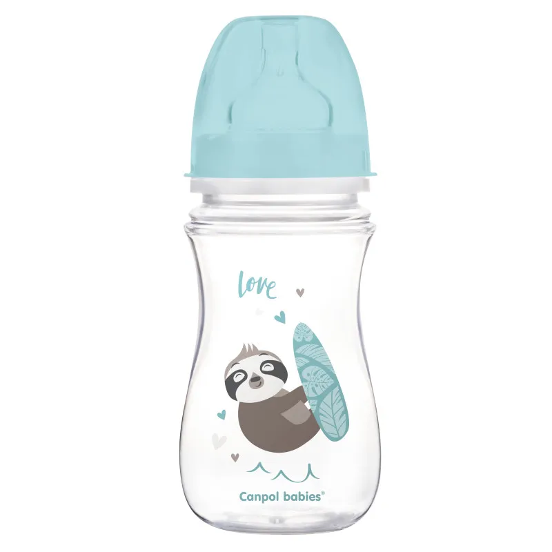 Бутылочка оснащена силиконовой антиколиковой соской с медленным потоком. Вентиляционный клапан соски обеспечивает эффективную циркуляцию воздуха и снижает риск колик. Широкая соска напоминает грудь матери, что способствует сочетанию грудного и бутылочного кормления.
