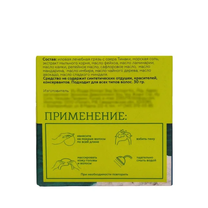 Состав: иловая лечебная грязь с озера Тинаки, морская соль, экстракт мыльного корня, масло фейхоа, масло ламинарии, масло камки, репейное масло, сафлоровое масло, масло мандарина, масло имбиря, масло чайного дерева, масло авокадо, масло сладкого миндаля.