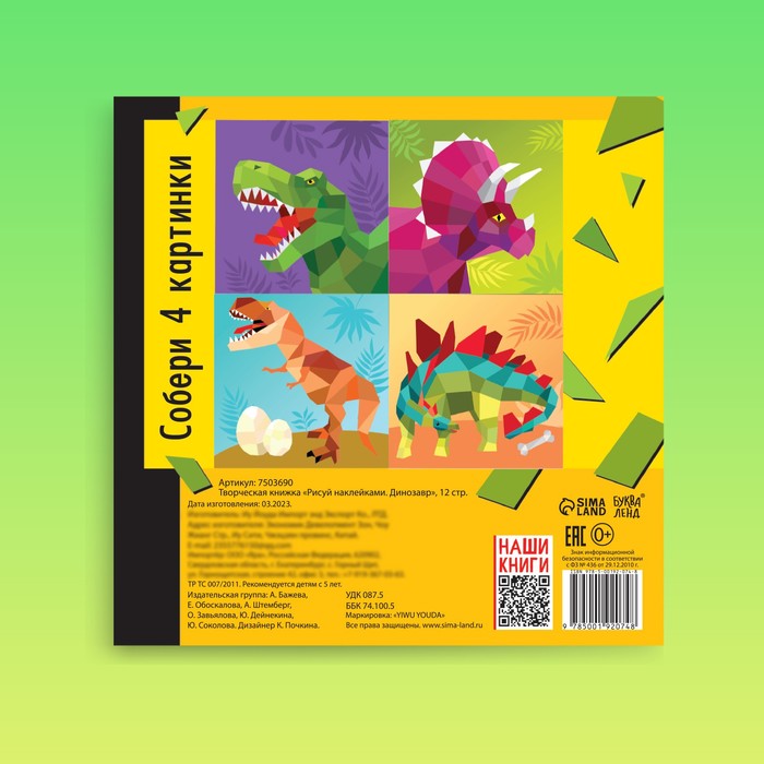 Творческая книжка «Рисуй наклейками. Динозавр», 12 стр., 4 картинки, 86 наклеек — Характеристики