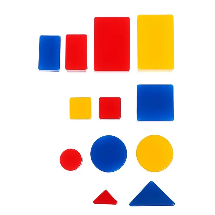 Разноцветные геометрические фигуры разработаны для обучения по системе Дьенеша. С набором ребёнок потренируется решать логические задачки и разделять предметы по определённым признакам.