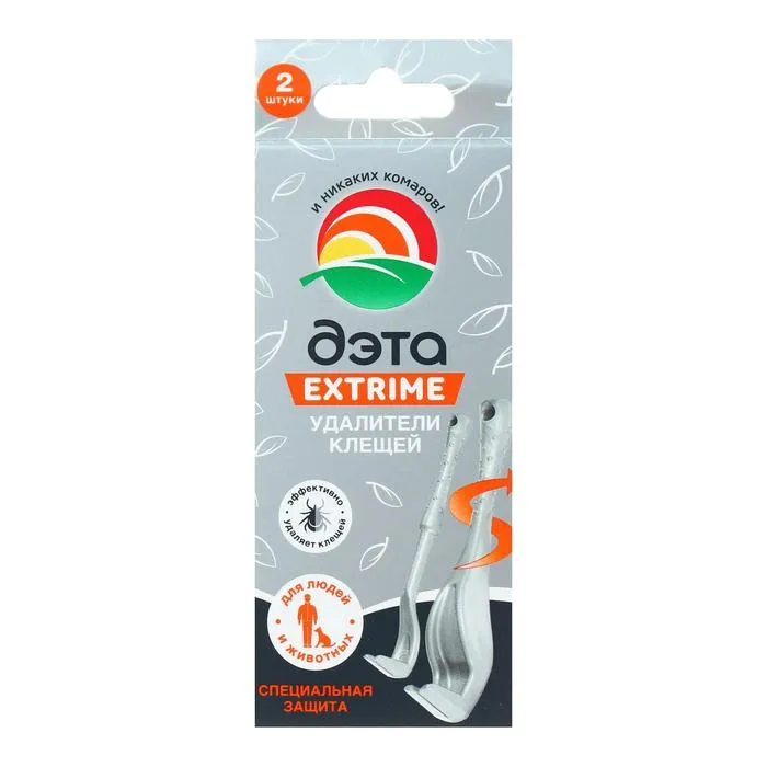 "Удалитель клещей для людей и животных ”ДЭТА” набор 2 шт предназначен для безопасного и эффективного удаления клещей с кожи людей и животных. Набор включает в себя два специальных инструмента, разработанных для удаления клещей различного размера без риска повреждения кожи.Инструменты изготовлены из высококачественных материалов, обеспечивающих долговечность и надежность при использовании. Их удобная конструкция позволяет быстро и безболезненно извлечь клеща, минимизируя риск передачи инфекций.Набор удалителей клещей ”ДЭТА” подходит как для использования дома, так и в походных условиях, обеспечивая надежную защиту от клещей в любой ситуации. Благодаря компактным размерам и легкому весу, эти инструменты удобно хранить и брать с собой в путешествия.Безопасное удаление клещей с кожи человека и животного является важной профилактической мерой против передачи различных заболеваний, поэтому набор удалителей клещей ”ДЭТА” станет незаменимым помощником для всех, кто заботится о здоровье своих близких и домашних питомцев.Необходимость защиты от клещей актуальна в любое время года, особенно в период активности клещей, поэтому наличие надежного инструмента для удаления клещей является неотъемлемой частью заботы о здоровье. Набор удалителей клещей ”ДЭТА” обеспечивает быстрое, безопасное и эффективное удаление клещей, делая процесс защиты от них максимально удобным и безопасным.Способ применения: Выберите подходящий удалитель, в зависимости от размера клеща. Аккуратно заведите развилку под клеща. Слегка приподнимая удалитель, сделайте 2-3 круговых вращения до полного удаления клеща.