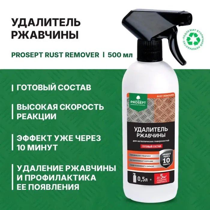 Удалитель ржавчины Prosept – идеально останавливает коррозию с поверхности металлов и различных минеральных поверхностей. После обработки на поверхности металла образуется плотная защитная пленка из нерастворимых в воде комплексных соединений, обеспечивающая высокую защиту от коррозии на срок до 12 лет. После обработки металлическая поверхность может покрываться любыми лакокрасочными составами. Средство повышает адгезию краски к оцинкованным и другим металлическим поверхностям.
