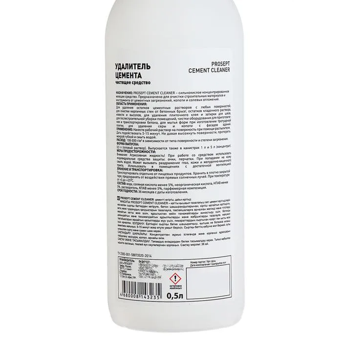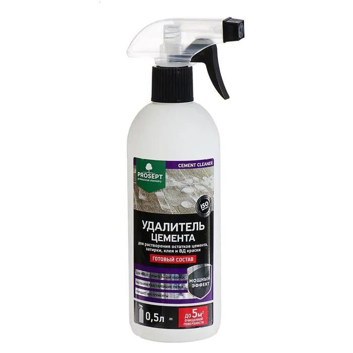 Удалитель цемента Prosept – сильнокислое концентрированное моющее средство, которое эффективно очищает строительный материал и инструменты от цементных загрязнений, копоти и солевых отложений.