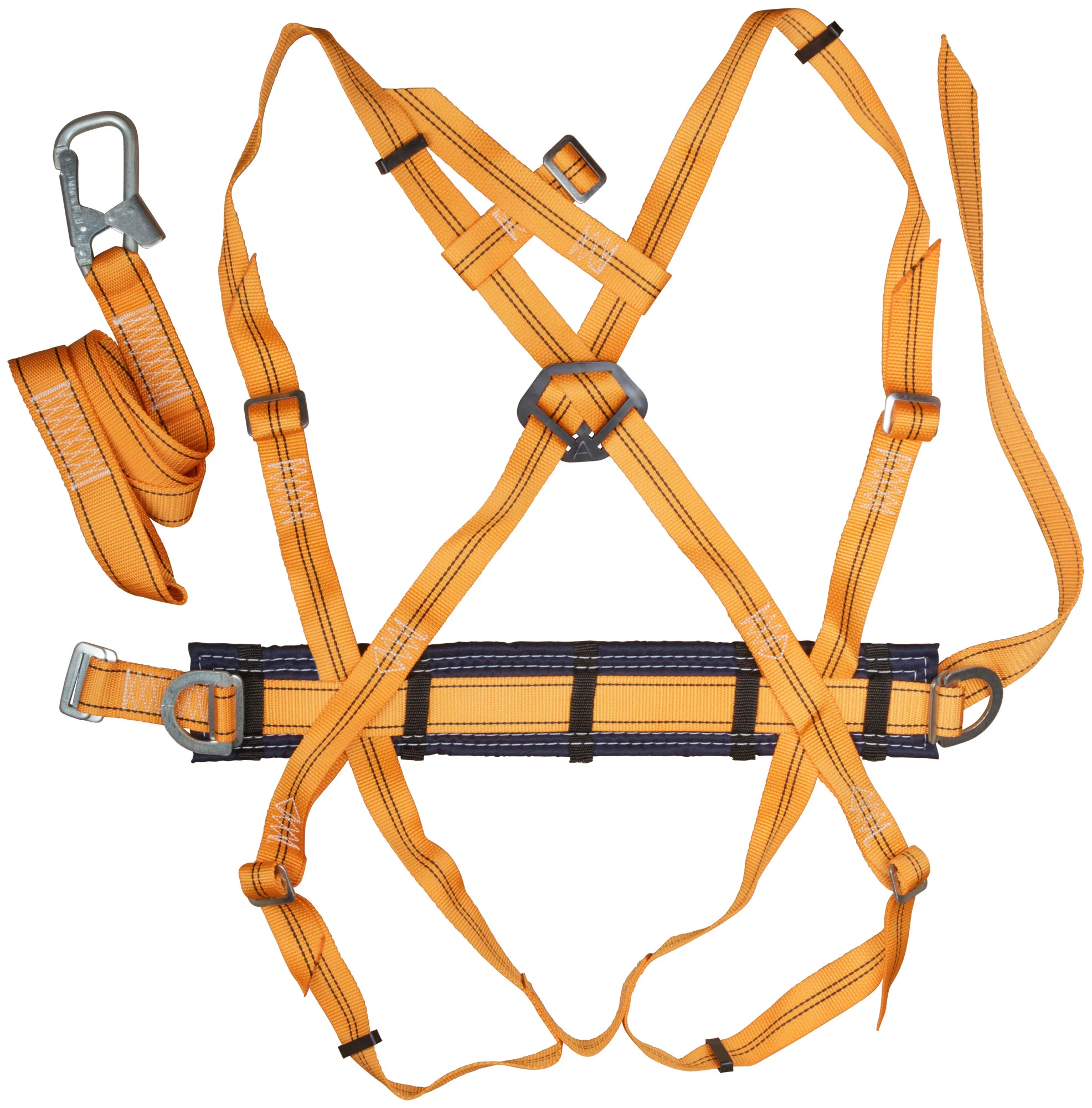 Конструкция включает привязь с наплечными и набедренными лямками, а также ремень с пряжкой, кушак, два D-кольца на поясе и одно на спине. Комплект дополнен стропом из прочной ленты и монтажным карабином. Материал изготовления — полиэфир и сталь, что гарантирует долговечность и надежность.