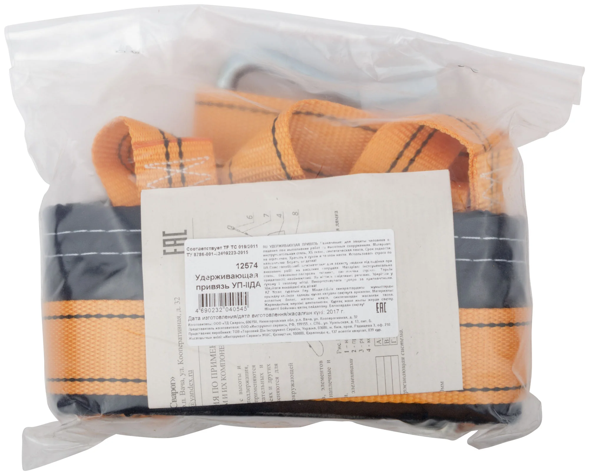 Привязь имеет три точки крепления, что позволяет равномерно распределить нагрузку и обеспечить дополнительную безопасность. Упаковка из полиэтилена защищает изделие при транспортировке и хранении.