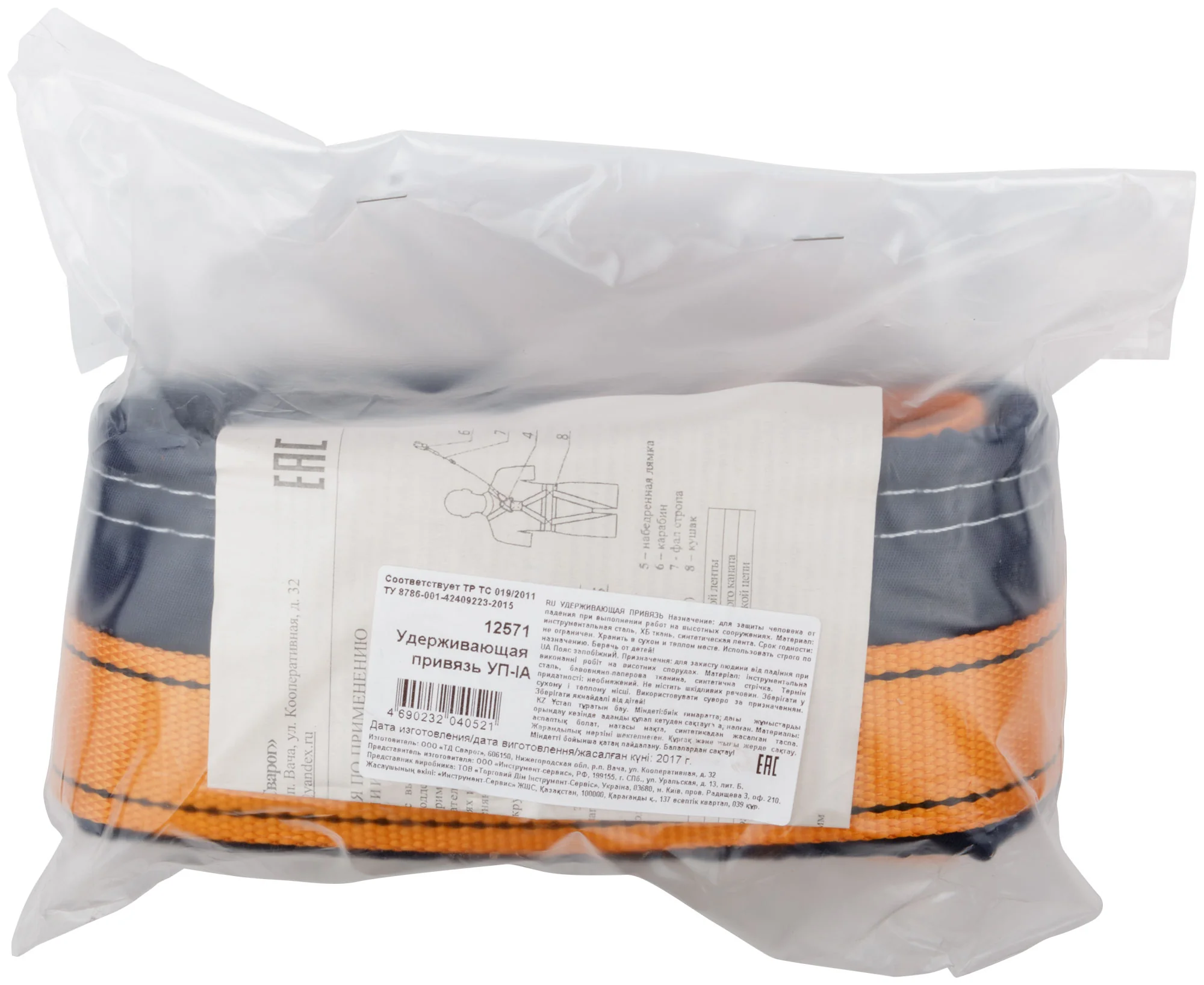 Конструкция привязи включает в себя ремень с пряжкой, кушак и два D-кольца. Строп выполнен из прочной полиэфирной ленты и снабжен монтажным карабином для удобного крепления. Продукт соответствует стандарту ГОСТ Р ЕН 358-2008, что гарантирует надежность и долговечность в эксплуатации.