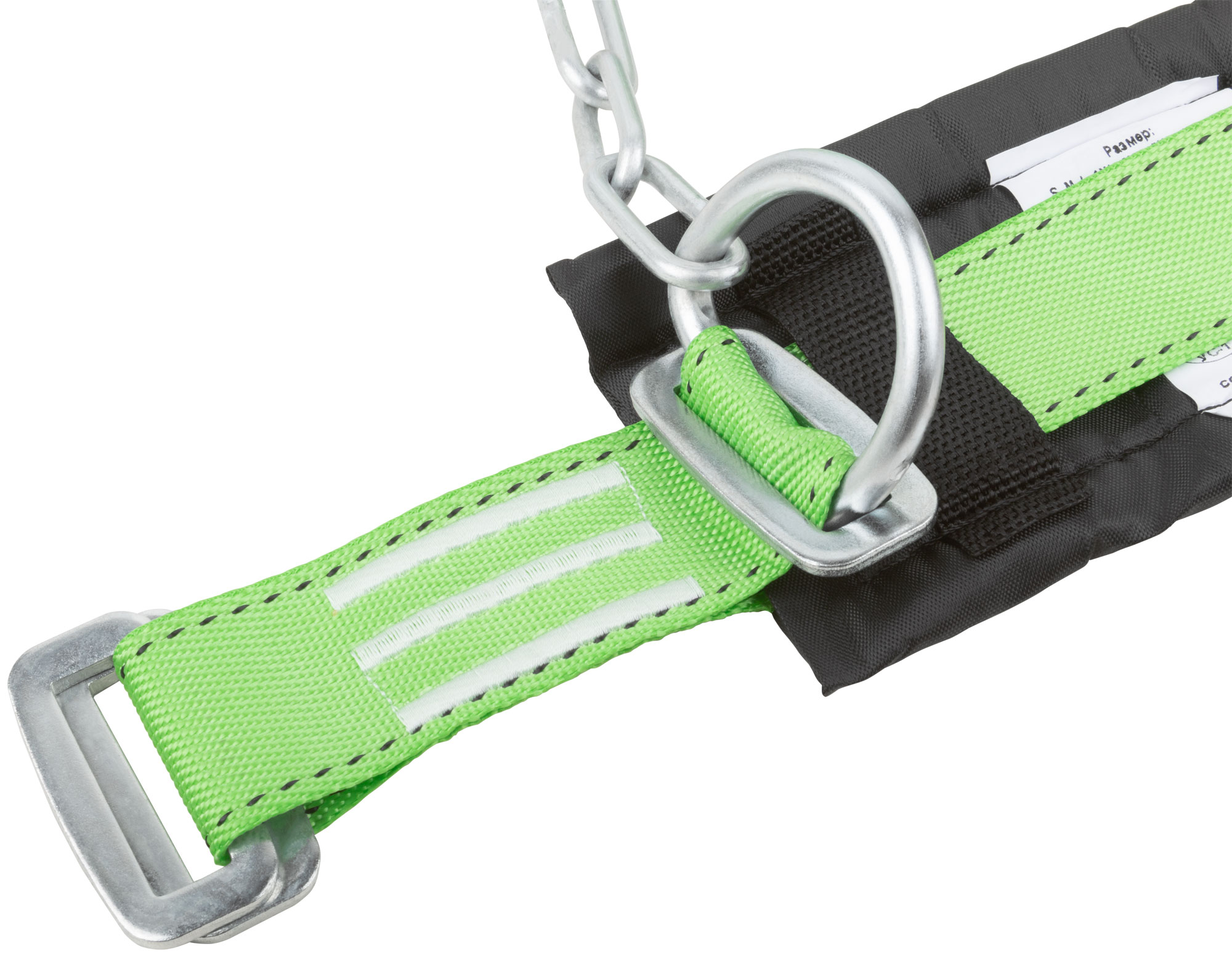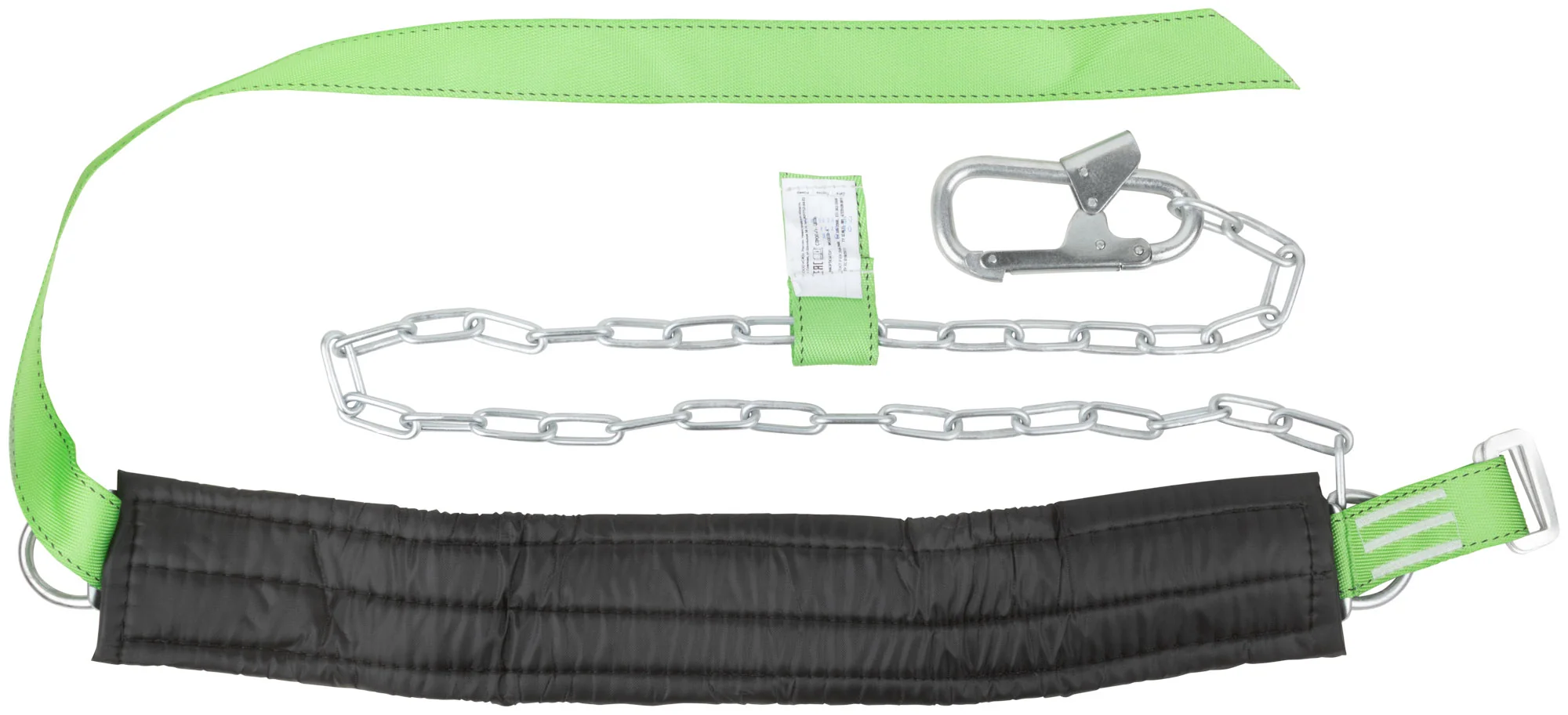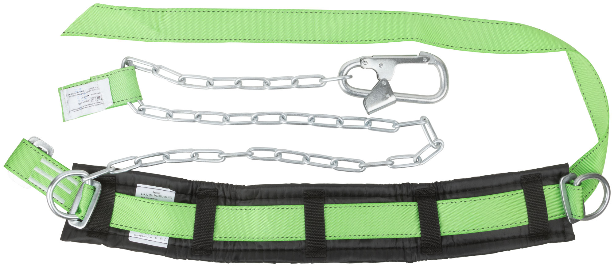 Привязь состоит из ремня с пряжкой, кушака и двух D-колец, а также стропа, выполненного из ленты и цепи. Материалы, использованные для изготовления — полиэфир и сталь, которые гарантируют долговечность и надежность конструкции. Упаковка привязи — полиэтиленовый пакет, что удобно для хранения и транспортировки.