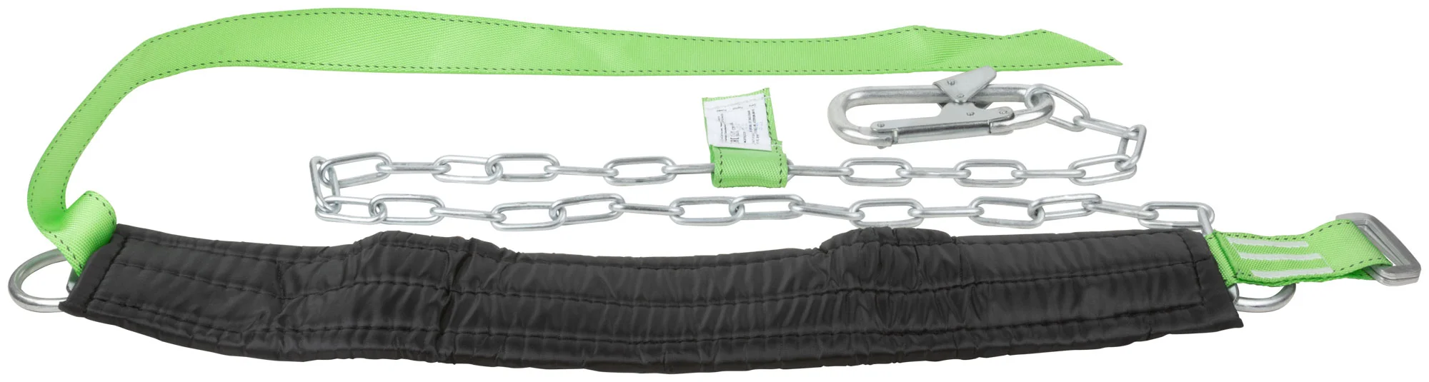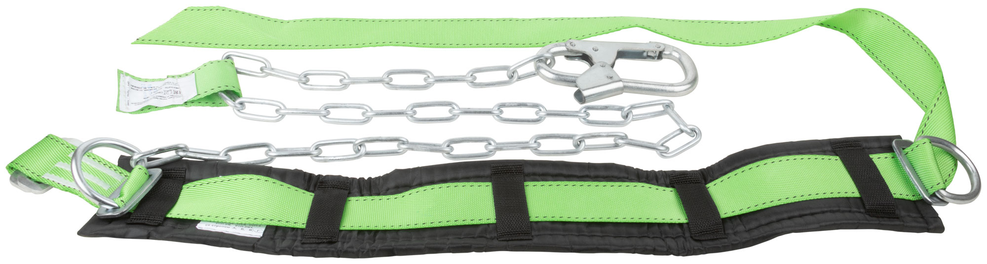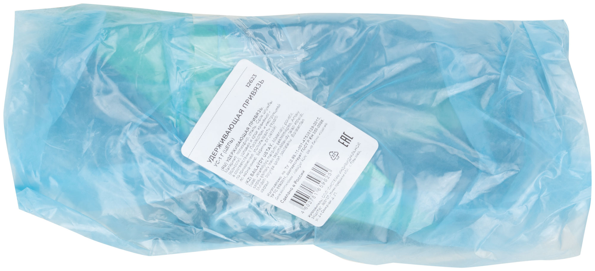 Привязь состоит из ремня с пряжкой, кушака и двух D-колец, а также стропа, выполненного из ленты и цепи. Материалы, использованные для изготовления — полиэфир и сталь, которые гарантируют долговечность и надежность конструкции. Упаковка привязи — полиэтиленовый пакет, что удобно для хранения и транспортировки.