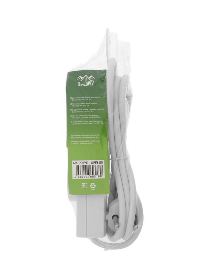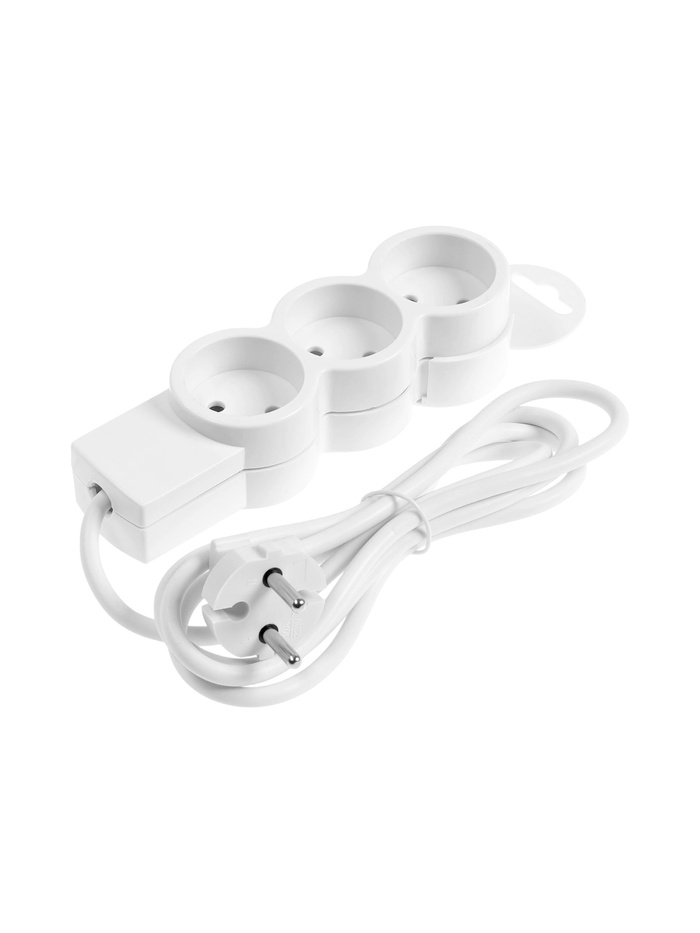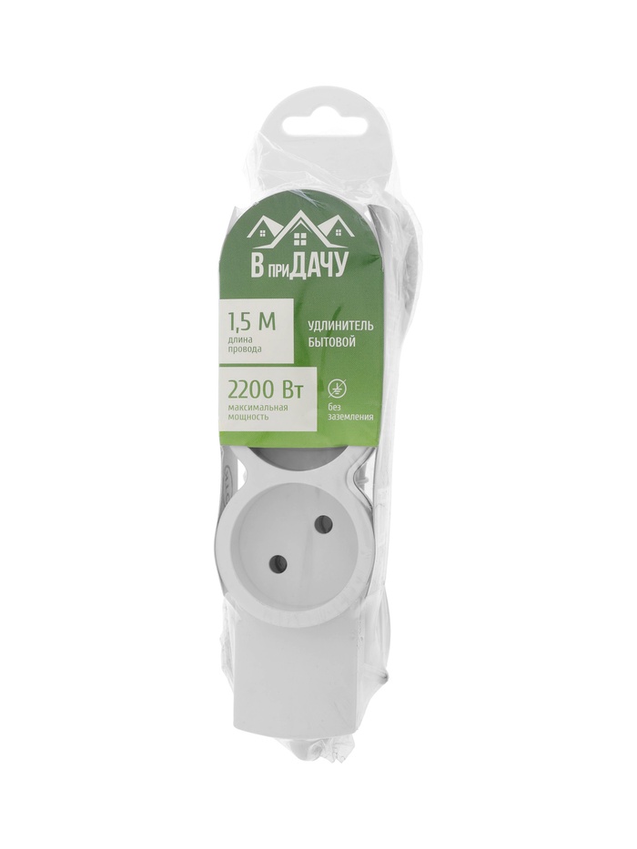 Удлинитель бытовой, 3 розетки, 1.5 м, 10 А, 2200 Вт, ПВС 2×0.75 мм², без заземления, белый — Характеристики