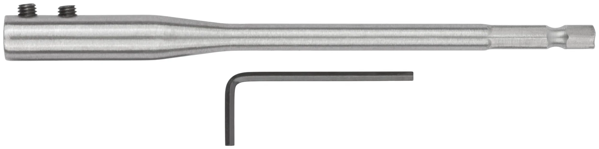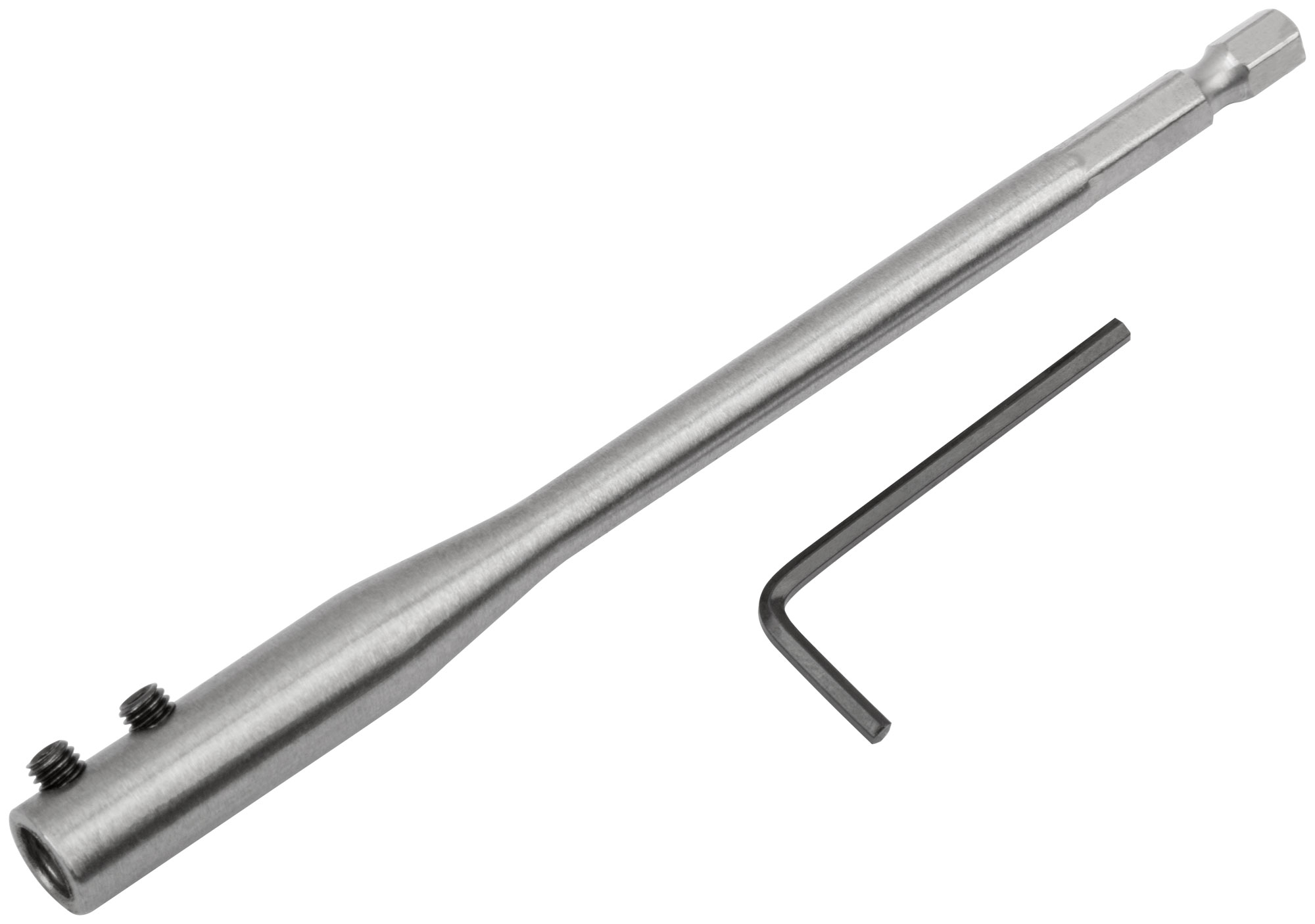 Изготовлен из прочной инструментальной стали, удлинитель обеспечивает надежное соединение с перовыми сверлами. Комплектуется шестигранным ключом для удобного крепления и надежной фиксации на хвостовике сверла.