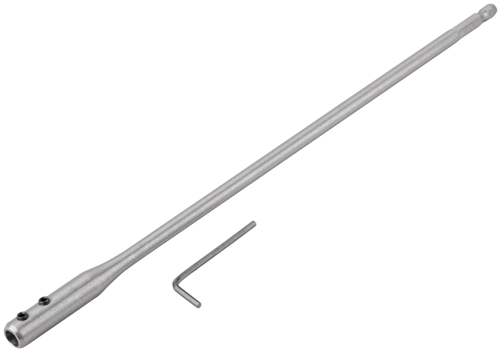 Изготовленный из высококачественной инструментальной стали, удлинитель обладает прочностью и долговечностью. Он совместим с перовыми сверлами, имеющими шестигранный хвостовик. В комплект входит шестигранный ключ для надежной фиксации сверла.