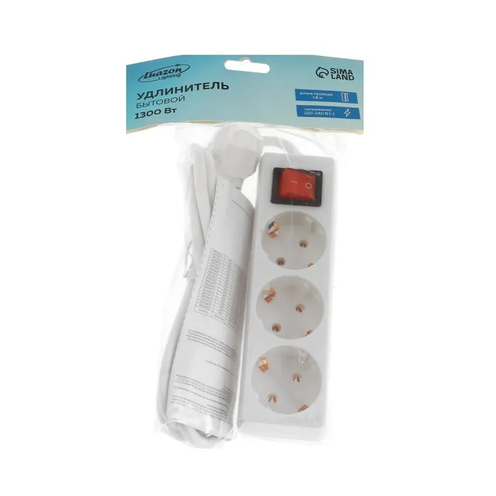Удлинитель Luazon Lighting, 3 розетки, 1,8 м, 10 А, 1300 Вт, 3х0.75 мм2, с з/к, с выкл., Б — Характеристики