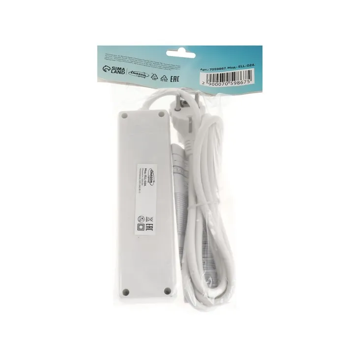 Удлинитель Luazon Lighting ECO, 5 розеток, 5 м, 10 А, 2200 Вт, ПВС 3х0.75 мм2, с з/к, белый