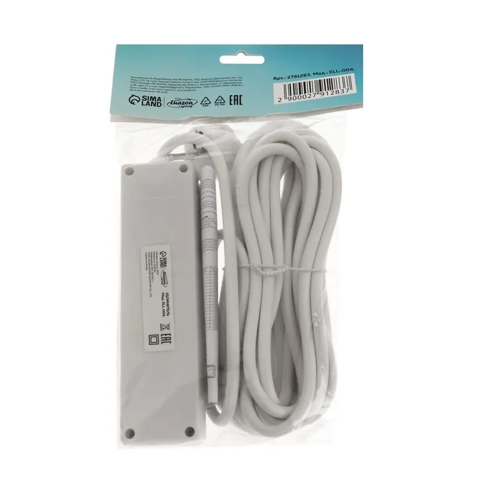 Удлинитель Luazon Lighting, 3 розетки, 5 м, 6 А, 1300 Вт, 3×0.75 мм2, с заземлением, с выключателем, белый