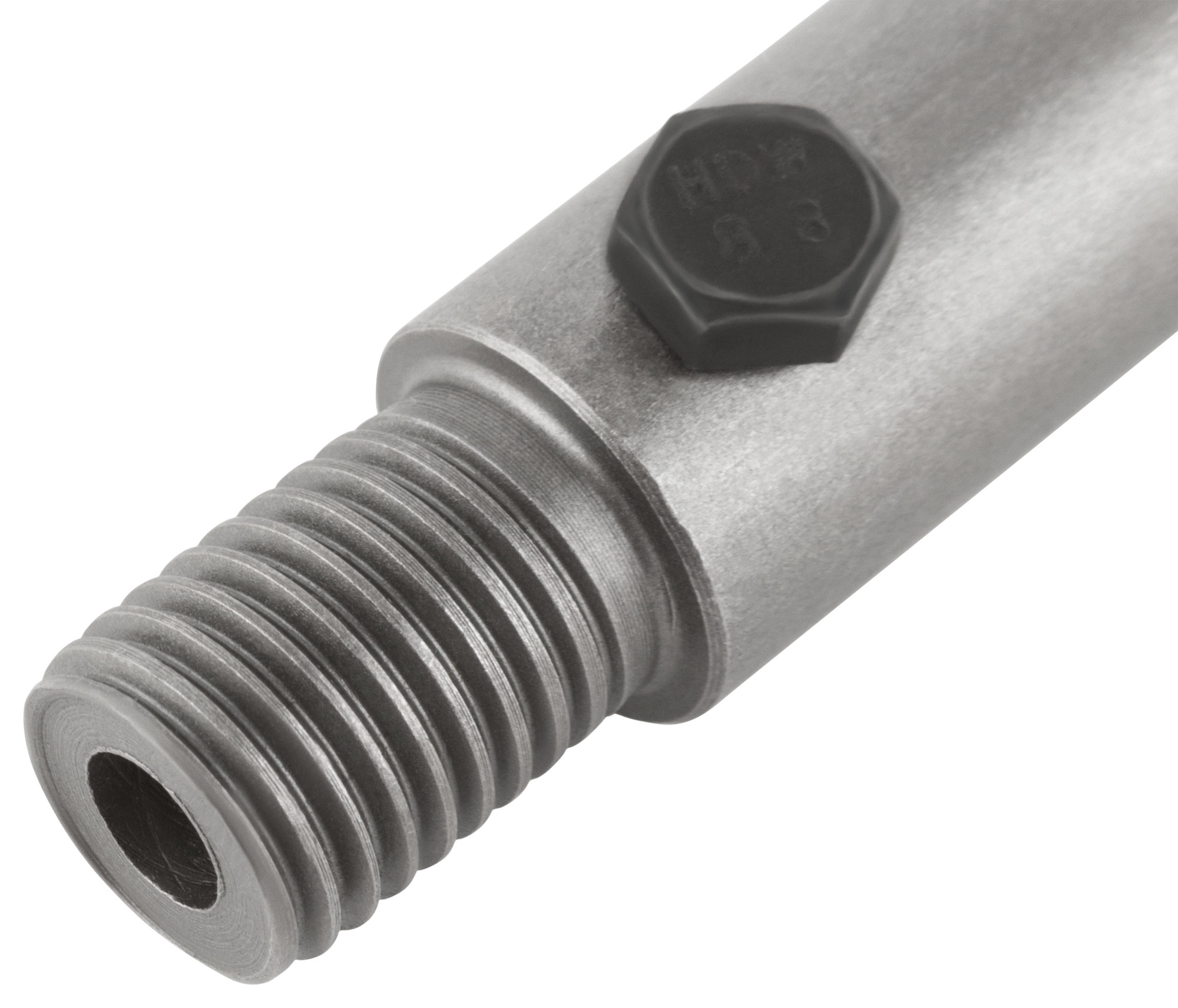 Конструкция удлинителя включает резьбовую посадку М16, что упрощает замену коронок и обеспечивает надежное крепление. Удлинитель изготовлен из легированной инструментальной стали с добавлением хрома, что гарантирует долговечность и устойчивость к износу даже при интенсивной эксплуатации.