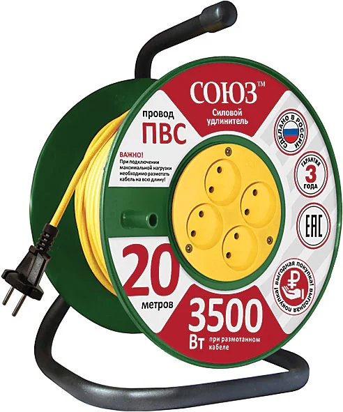 Силовой удлинитель "СОЮЗ" на катушке длиной 30 метров идеально подходит для временного подключения электроинструментов на строительной площадке или в мастерской. Его мощность до 3500 Вт позволяет использовать широкий спектр оборудования, от дрелей до небольших сварочных аппаратов, обеспечивая надежное электроснабжение.