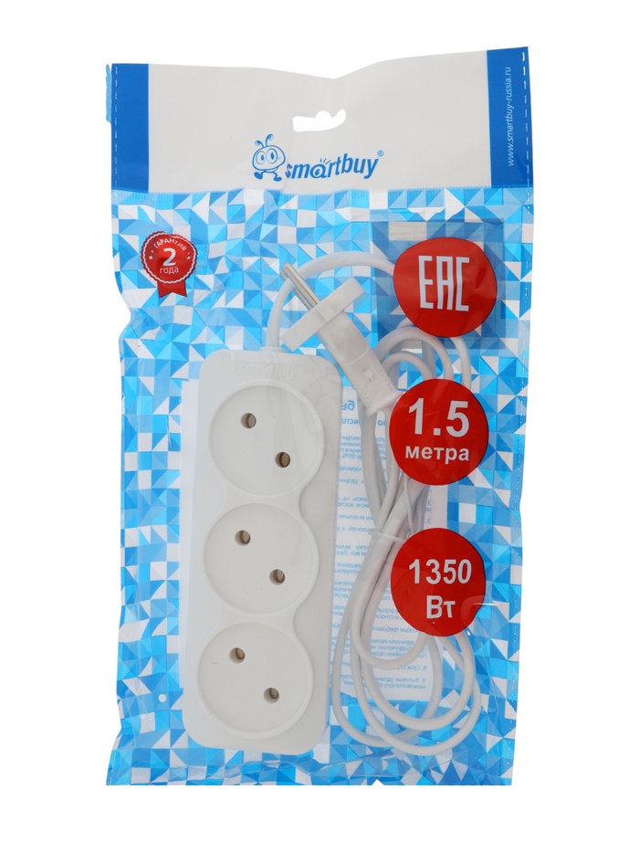 Удлинитель Smartbuy, 3 розетки, 1.5 м, 6 А, 1300 Вт, ШВВП 2×0.75 мм², без заземления, белый — Характеристики