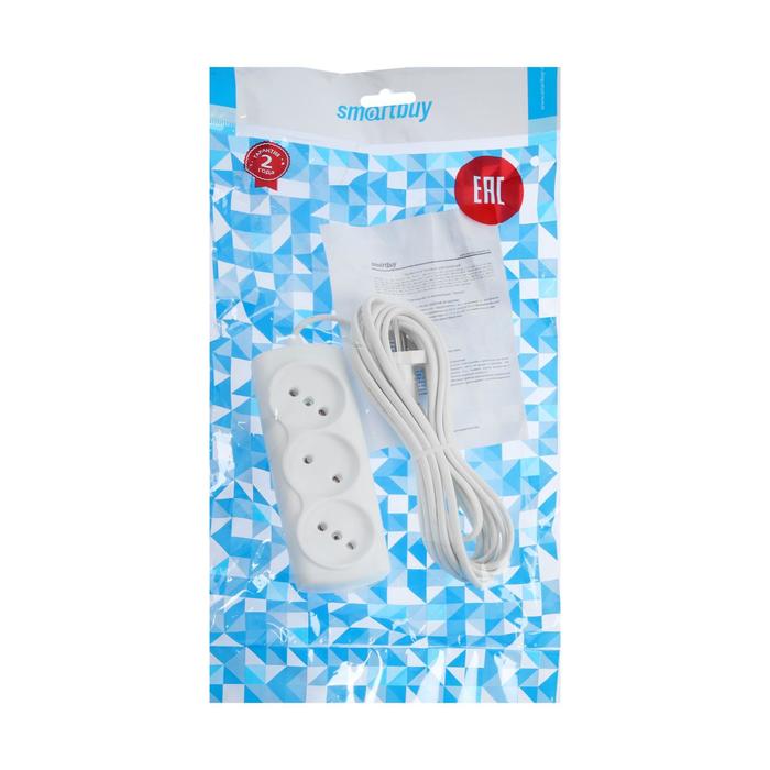 Удлинитель Smartbuy, 3 розетки, 5 м, 6 А, 1300 Вт, ШВВП 2х0.75 мм2, без з/к, белый