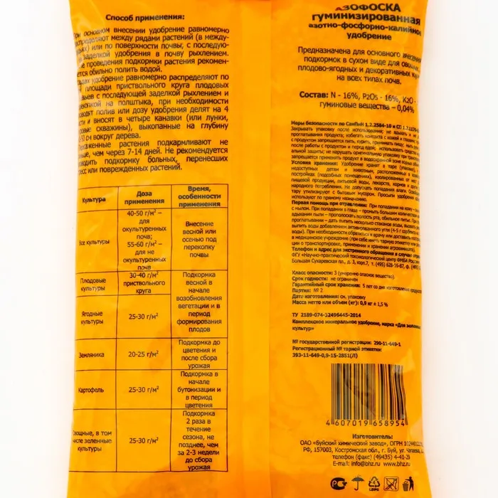 Сложное азотно-фосфорно-калийное удобрение - NPK. Применяется для основного, предпосевного и местного внесения в рядки при посеве, а также для подкормки растений на всех типах почв и под все сельскохозяйственные культуры. Не слеживается, обладает 100% рассыпчатостью, не гигроскопична. Нитроаммофоску вносят в качестве основного и припосевного удобрения на всех типах почв под все сельскохозяйственные культуры. Очень высокая агрохимическая и экономическая эффективность прослеживается при условиях прикорневой подкормки растений локально- ленточным способом на глубину 8-10 см. Наиболее эффективны эти удобрения на черноземах и почвах тяжелого гранулометрического состава. Благодаря разнообразию выпускаемых марок нитроаммофоски удобрение может быть подобрано индивидуально, с учетом особенностей типа почвы и выращиваемой культуры.