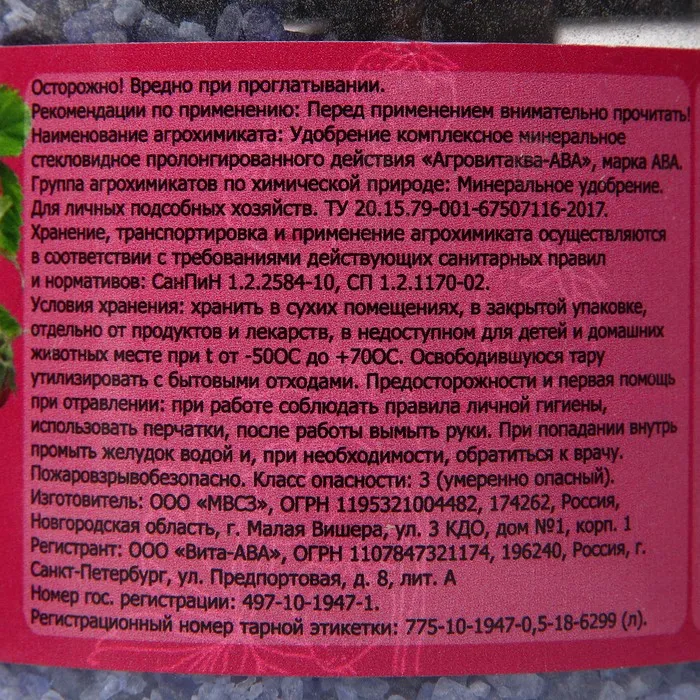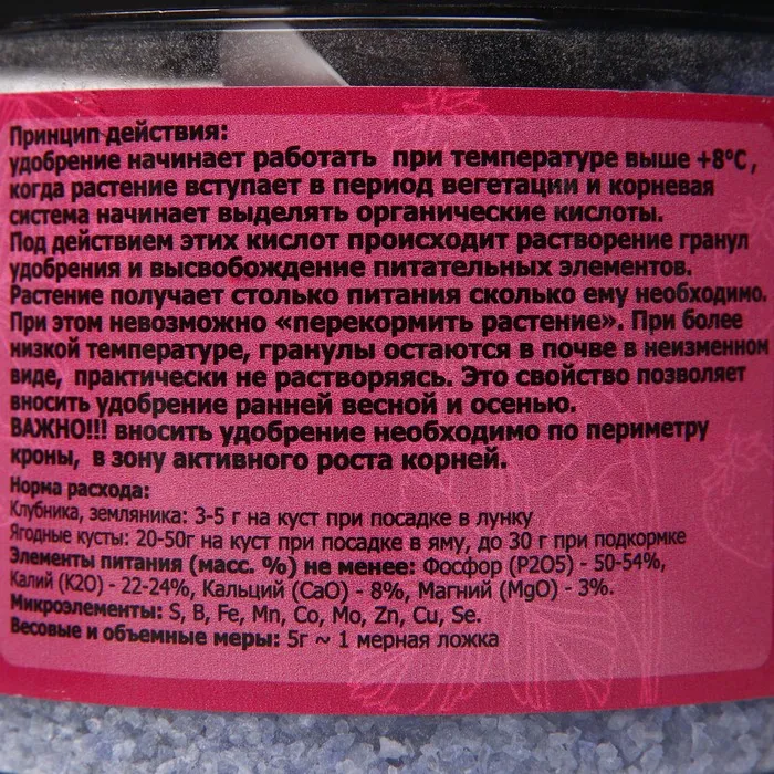 Клубника, земляника: 3-5 г на куст при посадке в лунку Ягодные кусты: 20-50г на куст при посадке в яму, до 30 г при подкормке Элементы питания (масс. %) не менее: Фосфор (Р2О5)-50-54%, Калий (К2О) - 22-24%, Кальций (СаО) - 8%, Магний (MgO) - 3%.