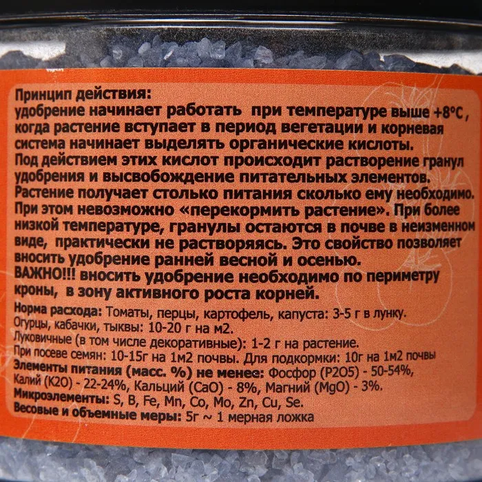 При посеве семян: 10-15г на 1м2 почвы. Для подкормки: 10г на 1м2 почвы Элементы питания (масс. %) не менее: Фосфор (Р2О5)-50-54%, Калий (К2О) - 22-24%, Кальций (СаО) - 8%, Магний (MgO)-3%. Микроэлементы: Ѕ, B, Fe, Mn, Co, Mo, Zn, Cu, Se.