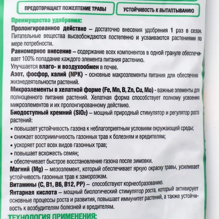 • повышает устойчивость газона к неблагоприятным условиям окружающей среды; • снижает восприимчивость газонных трав к болезням и вредителям;