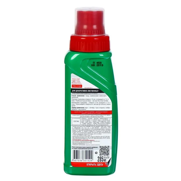 Уникальный состав удобрения, придает сочную зелень листьям, стимулирует рост и поддерживает иммунитет растений.