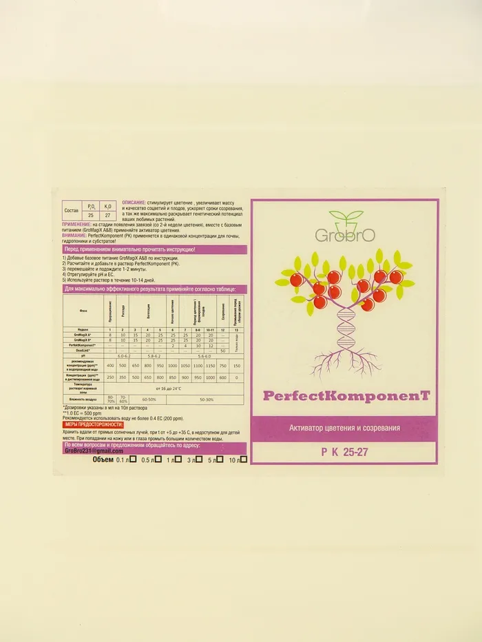 GroBro Perfect Komponent – это надежность и простота в одном флаконе. Доверьтесь профессиональному подходу к выращиванию и получите стабильный урожай без лишних усилий. Экономьте деньги, время и силы с удобрением, которое действительно работает! С GroBro ваши растения будут счастливы, а вы довольны. Выбирайте результативность и качество по доступной цене – закажите сейчас!