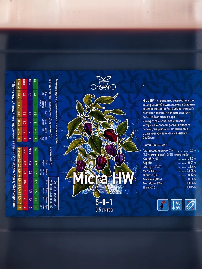 GroBro Serious Micra HW — надежный помощник для тех, кто хочет максимальной отдачи от своих растений. Простое в использовании, экономичное и действенное удобрение, которое сделает вашу гидропонику эффективной и результативной. Выберите это удобрение, и ваши растения ответят на заботу пышной зеленью и богатым урожаем. Не переплачивайте за сложные решения — доверьтесь надежному качеству GroBro!