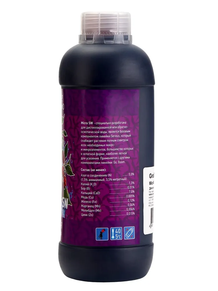 Удобрение для гидропоники GroBro Serious Micra SW, объемом 1000 мл, создано специально для поддержания здоровья и роста растений в гидропонных системах. Этот высококонцентрированный комплекс содержит тщательно сбалансированный состав микроэлементов, включая магний, бор, цинк и другие питательные вещества, необходимые для оптимального развития корневой системы и фотосинтеза. Подходит как для профессионального, так и для любительского выращивания растений. Используйте GroBro Serious Micra SW для максимальной урожайности и качественного роста ваших культур.