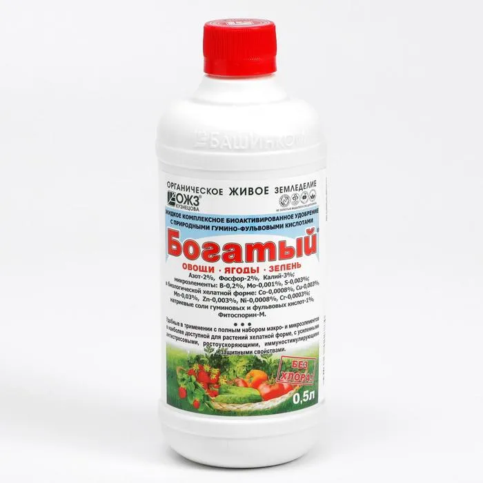 Жидкое комплексное удобрение представляет собой водный раствор солей гуминовых кислот, обогащённый макро- и микроэлементами. Применяется для некорневой и корневой подкормки вегетирующих растений, а также для предпосевной обработки семян.