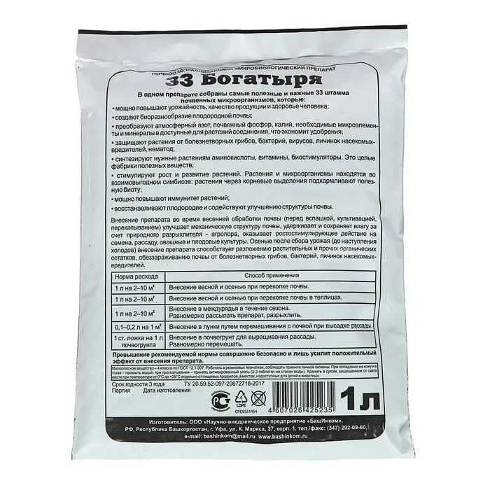 Состав: органический и минеральный носитель, 33 штамма полезных почвенных микроорганизмов в споровой форме.