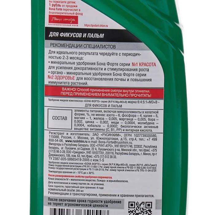 Удобрение для пальм и фикусов Bona Forte, флакон, 285 мл — Характеристики