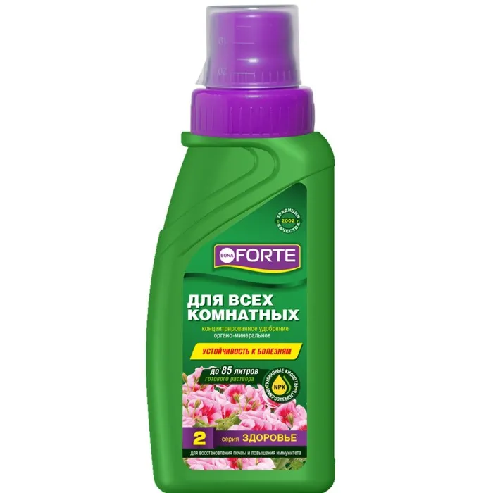 Серия ЗДОРОВЬЕ создана лабораториями Bona Forte для восстановления истощенной почвы и повышения иммунитета растений.Подходит для диффенбахии, драцены, замиокулькаса, маранты, монстеры, плюща, сансевиерии, фатсии, фикусов, филодендрона, антуриума, бальзамина, бегонии, гардении, герани, гибискуса, камелии, кливии, спатифиллума, фиалки, фуксии, хойи, цикламена, юкки и многих других. Здоровье – первый и основной шаг к красоте декоративных растений. Удобрение содержит полный комплекс веществ, необходимых для полноценного и сбалансированного питания растений.