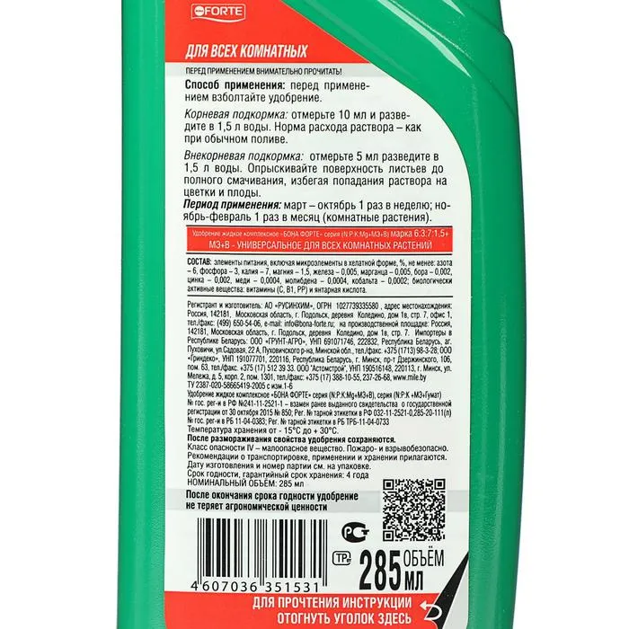 NPK+Mg (6:3:7 + 1,5 ), микроэлементы, витамины, стимулятор роста - янтарная кислота.Cрок годности: 4 года. После окончания срока годности удобрение не теряет своей агрономической ценности.Температура хранения: -15° до +30° С.После размораживания продукт сохраняет свои свойства.