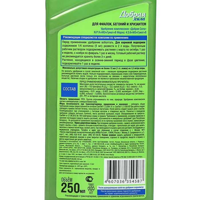 Удобрение "Добрая Сила", для фиалок, флакон, 250 мл — Характеристики