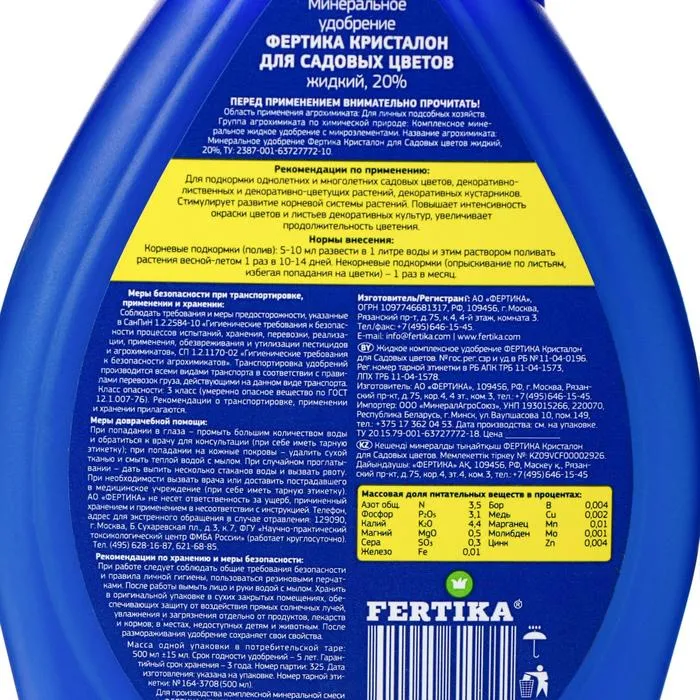 Удобрение «Фертика» Кристалон для садовых цветов — жидкий комплексный состав, богатый полезными веществами и микроэлементами. Способствует улучшению интенсивности окраски листьев и цветков, продолжительному цветению. Перед применением средство разбавляется в соотношении 1:100.