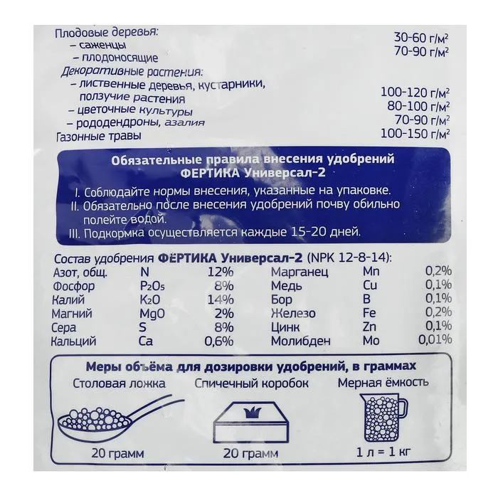 Содержит все необходимые для питания растений макро и микроэлементы в оптимальном соотношении.