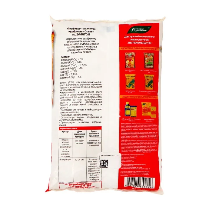 Комплексное минеральное удобрение. Назначение: фосфорно-калийное удобрение предназначено для внесения под огородные, садовые и декоративные культуры. Эффективно использовать осенью при перекопке почвы, при закладке посадочных ям, для подкормок в период плодоношения и в конце вегетации. Доза применения препарата: 35-60 г на 1 м2 - при осенней обработке почвы, 35-60 г на 1 м2 - совместно с азотными удобрениями - при весенней обработке почвы. Время, особенности применения: 1 столовая ложка вмещает 20 г удобрения. Состав: P2O5 (%): 5; K2O (%): 18; CaO (%): 8; MgO (%): 2.5; S (%): 12. Микроэлементы: В - 0.15.