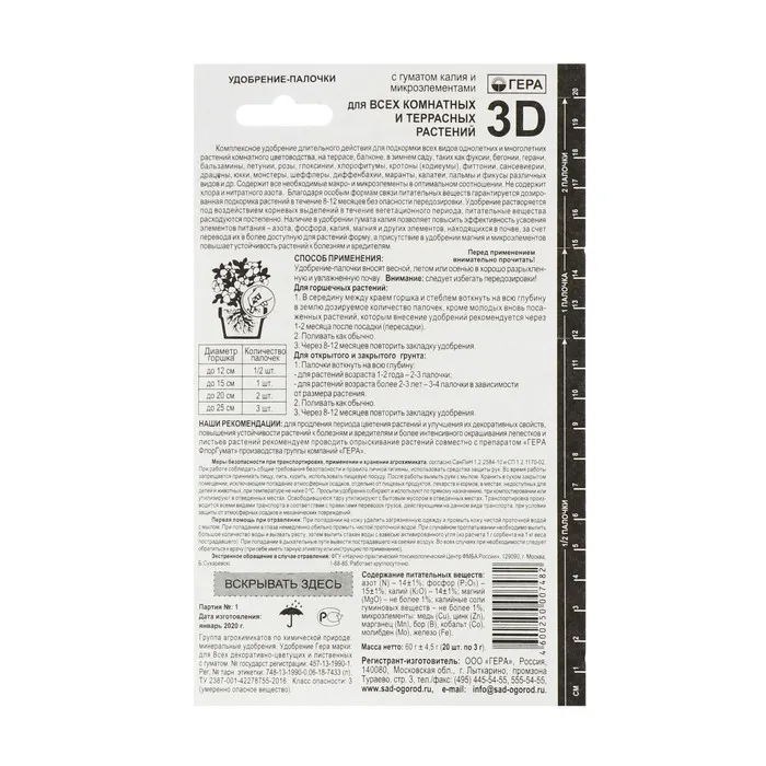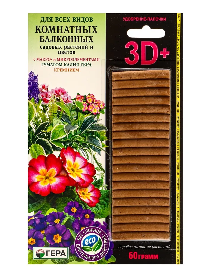 Комплексное удобрение длительного действия для подкормки всех видов однолетних и многолетних растений комнатного цветоводства, на террасе, балконе, в зимнем саду, таких как фуксии, бегонии, герани, бальзамины, петунии, розы, глоксинии, хлорофитумы, кротоны (кодиеумы), фиттонии, сансевиерии, драцены, юкки, монстеры, шеффлеры, диффенбахии, маранты, калатеи, пальмы и фикусы различных видов и др. Содержит все необходимые макро- и микроэлементы в оптимальном соотношении. Не содержит хлора и нитратного азота.