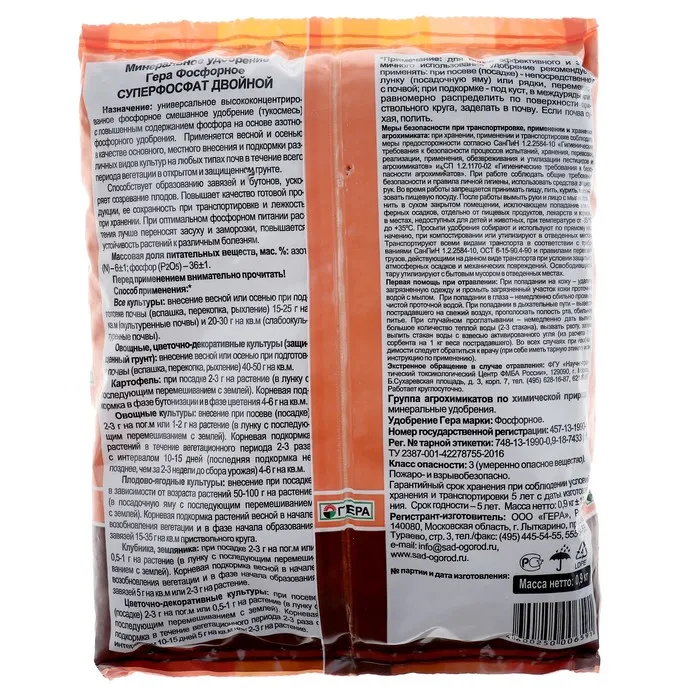 Удобрение "ГЕРА" Суперфосфат двойной, Фосфорное, 900 г — Характеристики