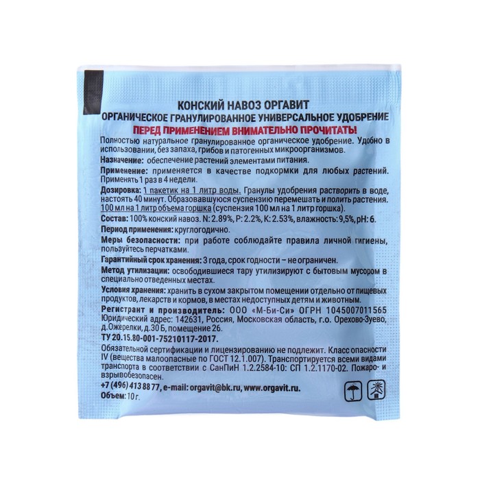 Удобрение гранулированное органическое Оргавит Конский, 10 г — Характеристики