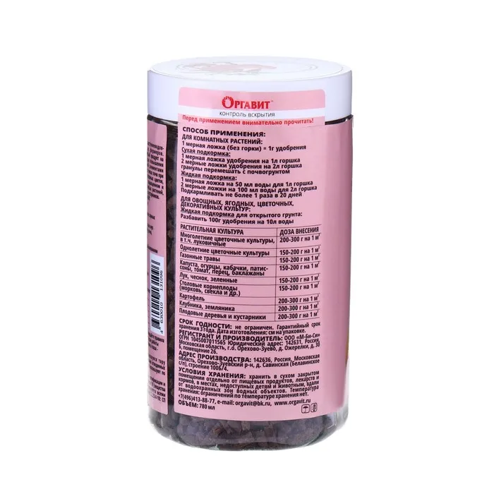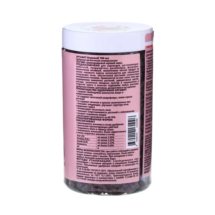 Удобрение "Оргавит Коровий" представлено в удобной упаковке весом 10 кг, что обеспечивает удобство хранения и транспортировки продукта. Гранулированная форма удобрения позволяет равномерно распределять его по почве и обеспечивает длительное действие питательных веществ.
